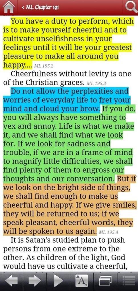 “But if we look on the bright side of things, we shall find enough to make us cheerful and happy. If we give smiles, they will be returned to us; if we speak pleasant, cheerful words, they will be spoken to us again.”